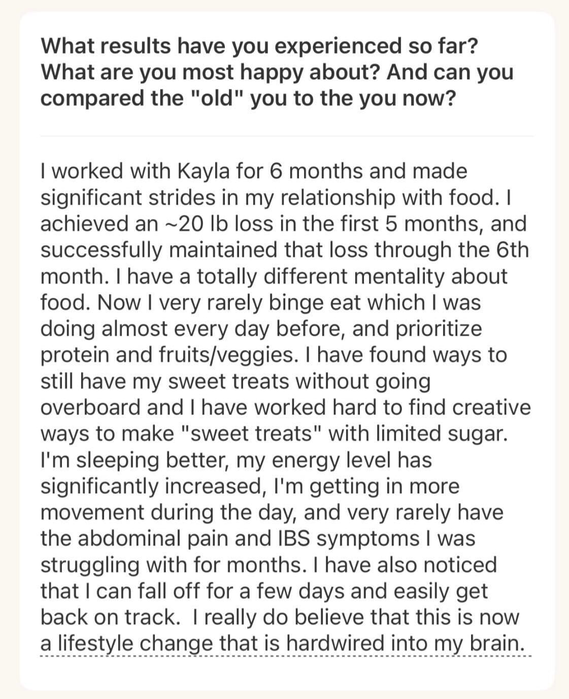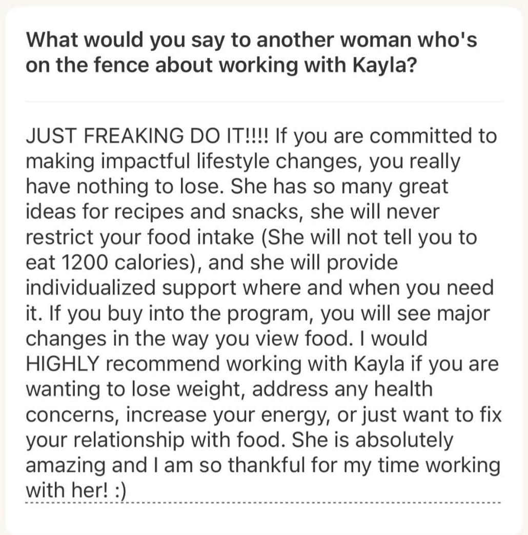 Hi, I’m Kayla, a Registered Dietitian and women’s weight loss coach dedicated to helping women lose weight in a healthy, sustainable way, without restrictive diets or medication. I combine science-backed nutrition, hormone-friendly strategies, and realistic lifestyle changes to help you feel confident in your body and finally achieve long-term fat loss that lasts. My mission is simple: to help you create a lifestyle you love while reaching your goals, with no extremes, just results.